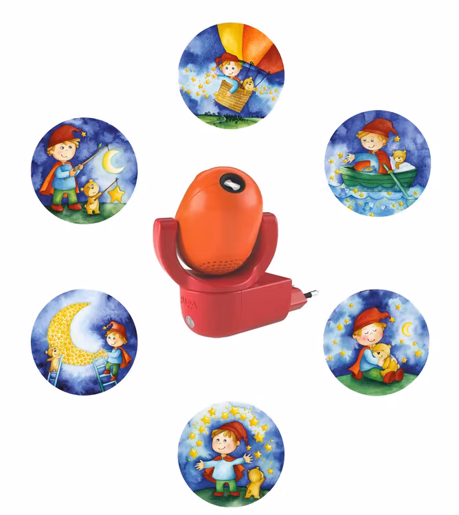 Nu kan du och ditt barn hitta på egna godnattsagor tillsammans med hjälp av fina bilder som projiceras på väggen eller i taket. Nattlampan monteras i ett vägguttag, innehåller sex sagomotiv och spelar även musik. Från HABA.