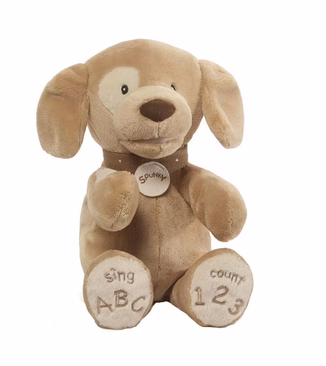 Glad animerad och sjungande hund i plysch från GUND®. Hunden sjunger en ABC-sång och en räknesång (på engelska) medan den rör på munnen och klappar händerna. 35 cm hög. Drivs med tre AA-batterier som ingår. Ytan är tvättbar. Från 10 månader.