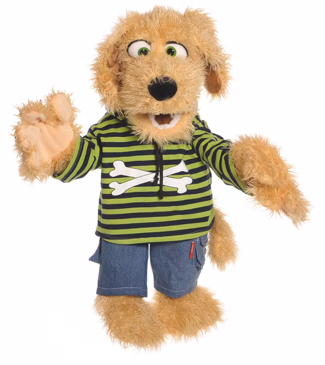 Bosse hund är stor, snäll och kramgo. Har byxor och tröja som kan tas av. Spelbar med huvud, mun och framtassar. 65 cm. Kan handtvättas. Från 0 år.